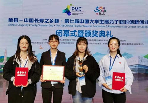 中国大学生高分子材料创新创业大赛(简称PMC大赛)是由中国石油和化学工业联合会、中国化工教育协会、橡胶谷集团联合打造的高分子材料领域国际性赛事,大赛已连续成功举办了六届,成果显著,得到了社会各界的良好反响和广泛认可。本届大赛共收到来自全国118所高校、357件参赛作品,有100所高校217支队伍进入初赛,创历届初赛作品数量之最。经过初赛专家网络评审,最终有15个省份43所高校的63支团队入围大赛决赛。我校水凝胶研究组队员分工明确,凭借团队成员们优秀的协调意识,排版规范的申请书,不断进行修改加工的答辩技巧,良好的组织能力和高度的责任心,迎得到评委们的高度赞赏,最终取得了优异成绩。