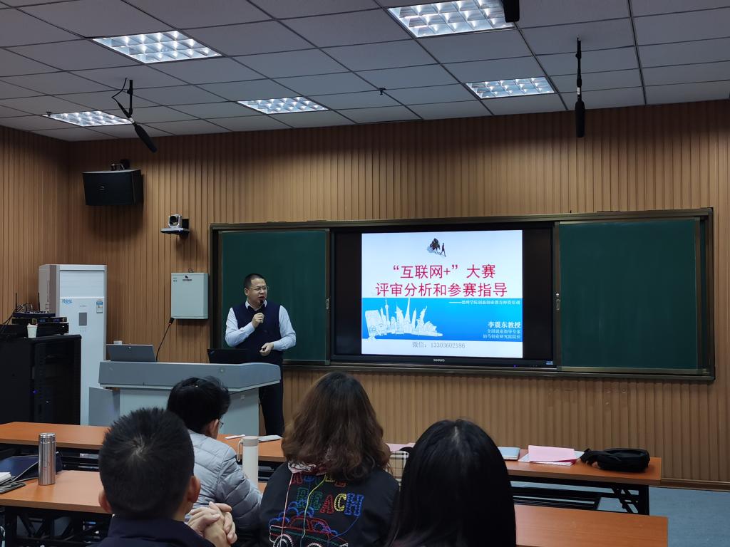11月8日上午,在厚德楼录播室413教室,李震东教授为各学院大学生科技文化竞赛的负责人、项目指导老师及部分学生做了“互联网+”大赛评审分析与参赛指导专题讲座。李震东教授从以新视角看互联网+创新创业大赛准备、六届互联网+创新创业大赛的要求变化、实战化创业项目指导方法与实践探索、构建创新创业教育生态系统模式四个方面进行了系统阐述,结合多年评审经历对评审专家特点、参加大赛注意事项进行了重点讲解,并对我校今年部分参赛项目进行点评。
