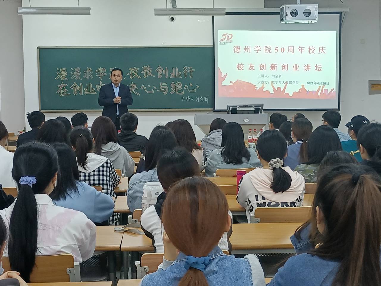 桃李盈门贺华诞、栋梁报国践初心。2021年4月20日,德州学院50周年校庆校友创新创业论坛报告之四在明理楼0255教室如期开讲。2000级首届数学与应用数学专业本科校友、山东诚合节能科技有限公司总经理、山东省半导体行业协会副秘书长闫余新应邀主讲,数学与大数据学院100余名师生聆听了讲座。