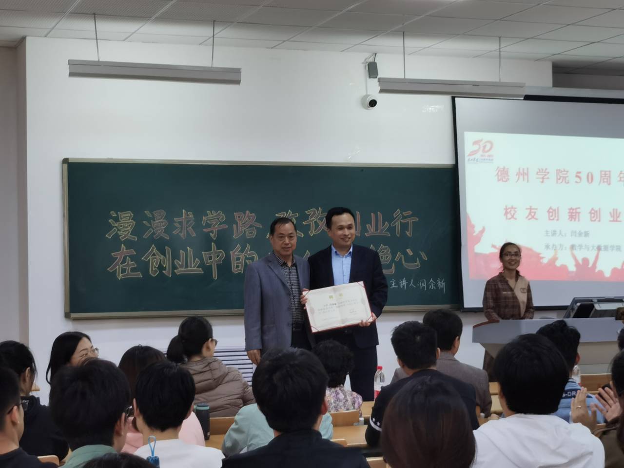 讲座中,举行了大学生创新创业导师聘任仪式,数学与大数据学院院长徐凤生为闫余新颁发了德州学院大学生创新创业导师聘书。