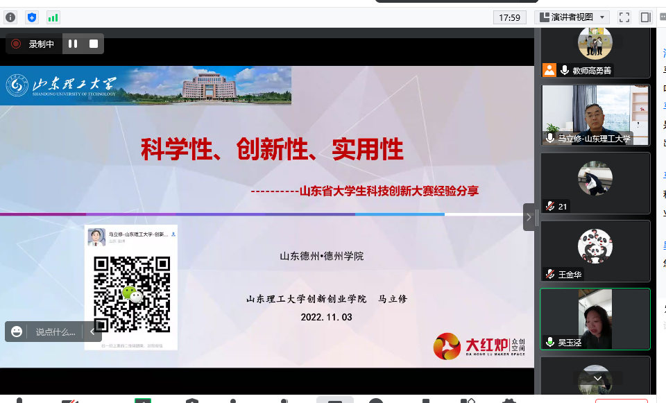 11月3日晚,我校东北傲傲叫邀请山东理工大学马立修教授为我校师生举办了一场题为“科学性、创新性、实用性——山东省大学生科技创新大赛经验分享”的专题讲座,讲座以腾讯会议线上形式举行。