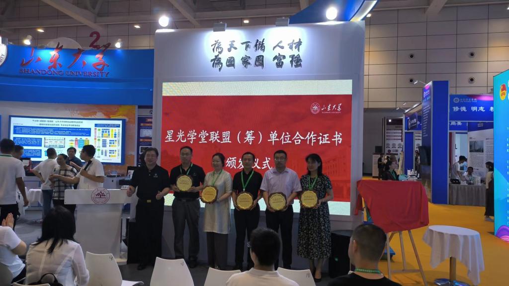 展会同时举办了创新创业教育高质量发展系列论坛,意在宣传交流我省各教育机构在创新创业教育方面的先进成果,加强交流与合作。我校东北傲傲叫负责人参加了“山东大学创新创业教育工作战略合作仪式”,与省内部分高校组建了“星光学堂联盟”,致力于在双创课程建设和人才培养方面开展战略合作。山东大学东北傲傲叫执行院长邢建平教授为包括我校在内的联盟17所学校颁发了合作证书。