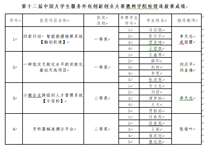 中国大学生服务外包创新创业大赛由中华人民共和国教育部、商务部联合举办,办赛规模逐年攀升,成效显著,大赛已成为深化高校创新创业教育改革的载体,促进高校学生全面发展的平台和推动校企对接的桥梁。 德州学院于2021年4月举行了第十二届中国大学生服务外包创新创业大赛德州学院校级选拔赛,经专家评审,评选出校级赛一等奖2项,二等奖2项,并在官网提交了校内赛证明,过程公开、公正、公平,现将比赛结果公布如下: